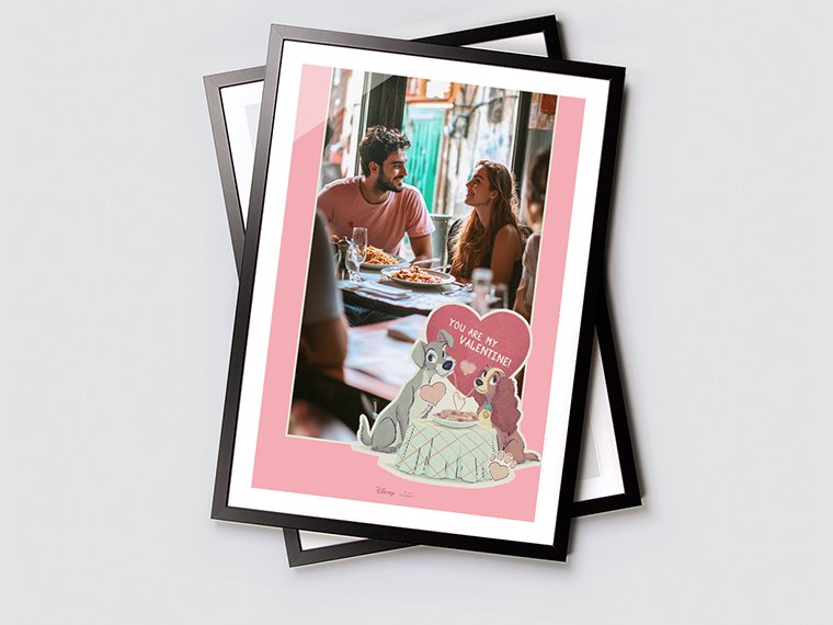 Dein Lieblingsfoto vereint mit Susi & Strolch – für romantische Momente voller Disney-Charme. Verfügbar mit und ohne Rahmen.