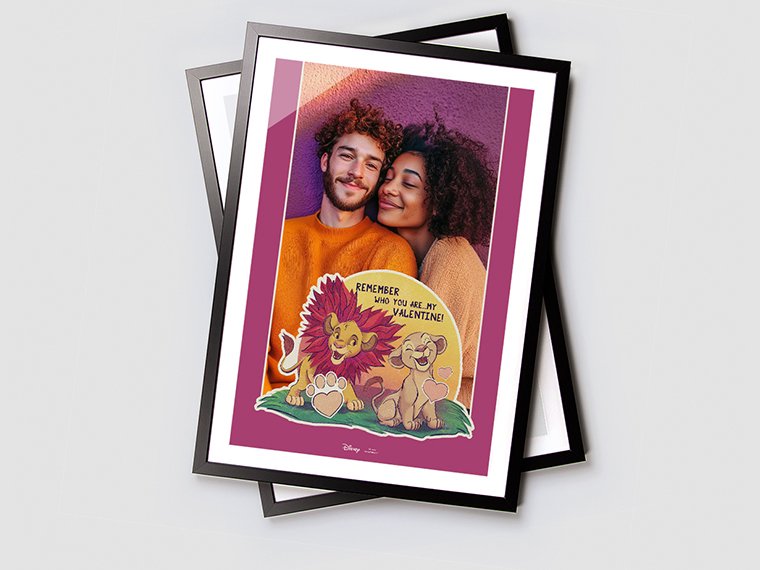 Dein Lieblingsfoto vereint mit Simba & Nala – für herzerwärmende Momente voller Disney-Magie. Verfügbar mit und ohne Rahmen.