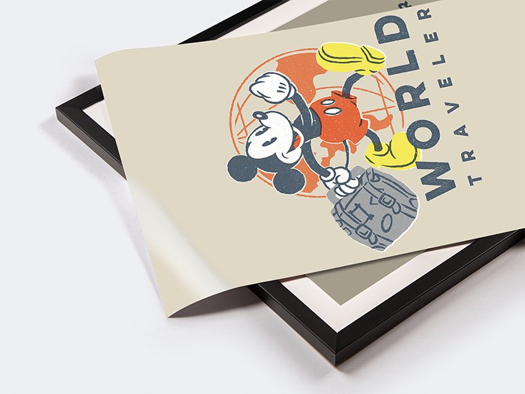 Ein stylisches Mickey-Poster im World-Traveler-Look – perfekt als Wandmotiv für Disney-Fans.