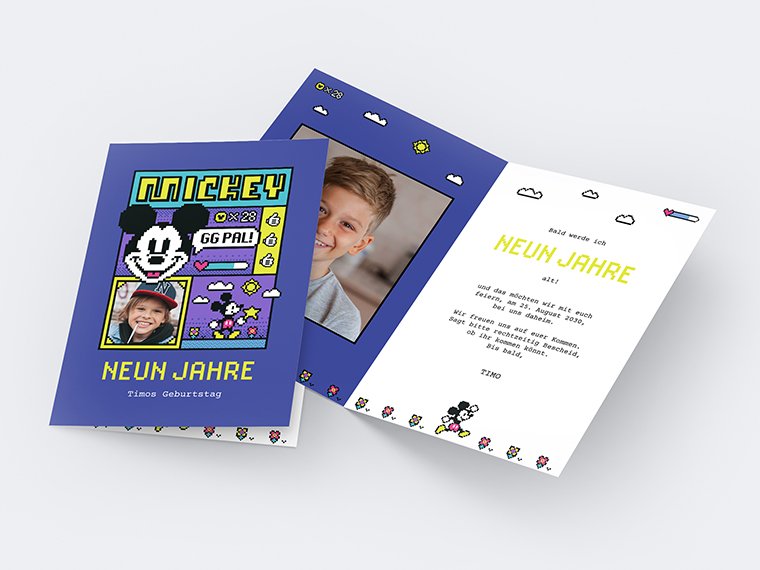 Mit unseren Mickey Mouse Karten, Minnie Grußkarten und Donald Design-Karten sendest Du Grüße, die von Herzen kommen. Ob Geburtstag, Babyglück, Einladung oder einfach ein fröhlicher Gruß: Wähle Dein Design, füge Fotos hinzu und gestalte Deine ganz persönliche Disney-Karte. Deine Botschaft – verpackt im unverwechselbaren Charme von Mickey & Friends.