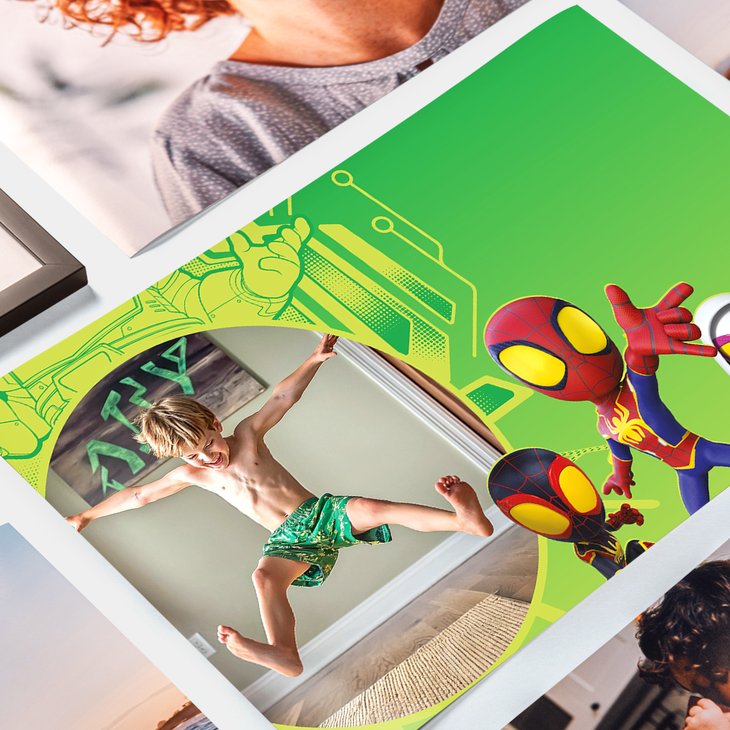Ob Du mit Spidey durch die Stadt schwingst oder mit Ghost-Spider und Miles spannende Abenteuer erlebst – mit unseren personalisierbaren Designs holst Du Dir den Superhelden-Spaß direkt nach Hause. Gestalte Deine eigenen Collagen, Karten oder Fotobücher mit den beliebten Helden aus Spidey and His Amazing Friends und bring Farbe, Action und Teamgeist an Deine Wände. Starte jetzt Dein persönliches Abenteuer mit Spidey & Friends!