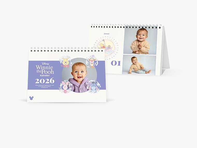 Ein niedlicher Winnie-Puuh Tischkalender – mit Deinen Fotos und zarten Illustrationen für ein Jahr voller kleiner Wohlfühlmomente.